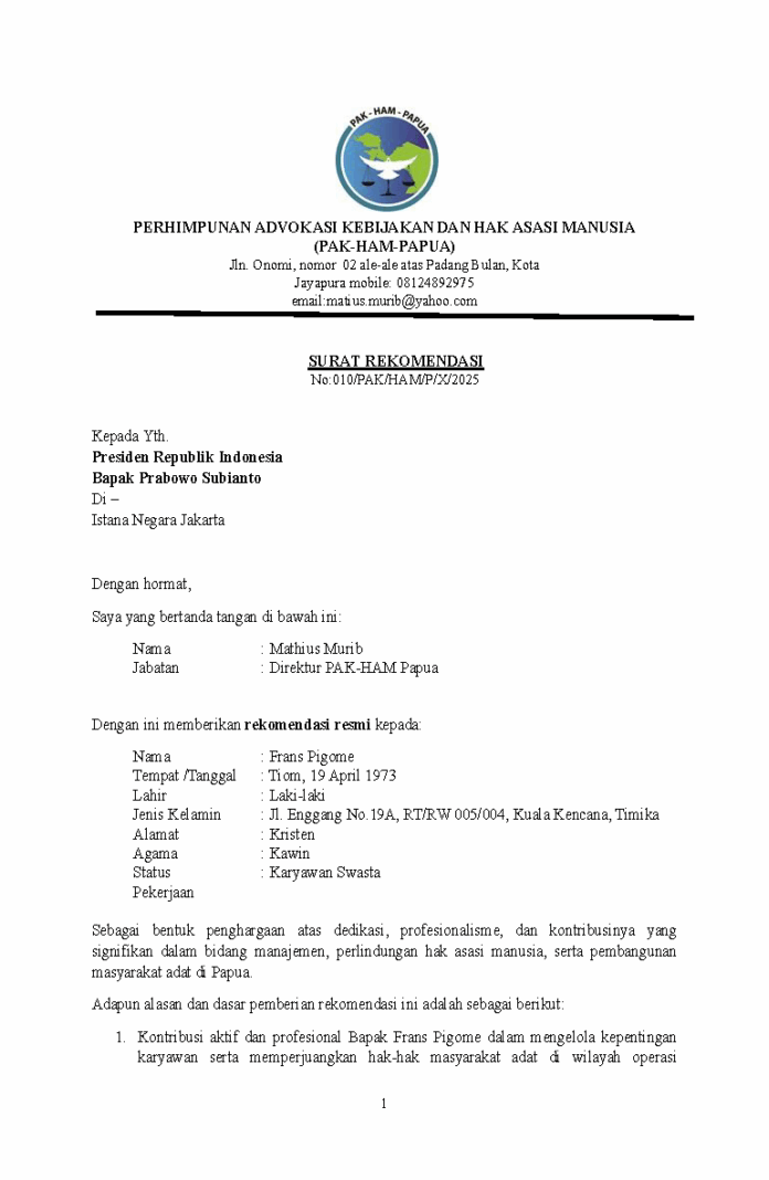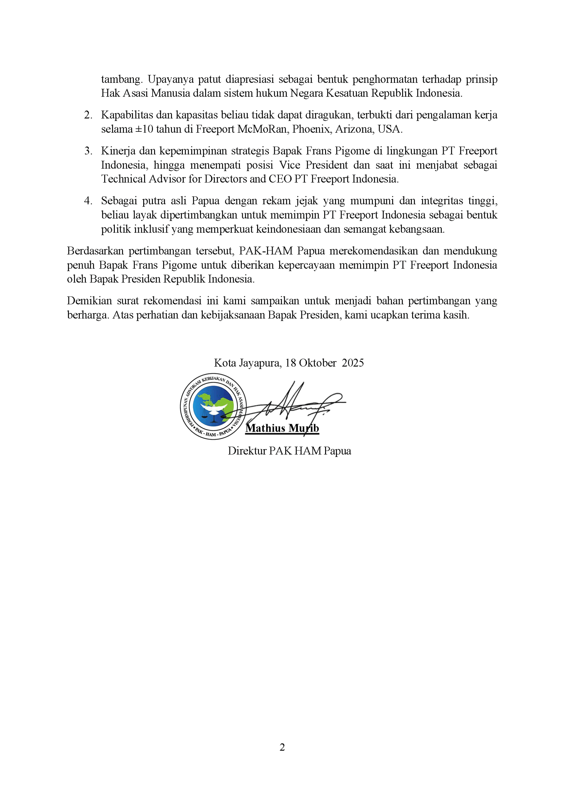 Sebagai putra asli Papua dengan rekam jejak yang mumpuni dan integritas tinggi, beliau layak dipertimbangkan untuk memimpin PT Freeport Indonesia sebagai bentuk politik inklusif yang memperkuat keindonesiaan dan semangat kebangsaan.