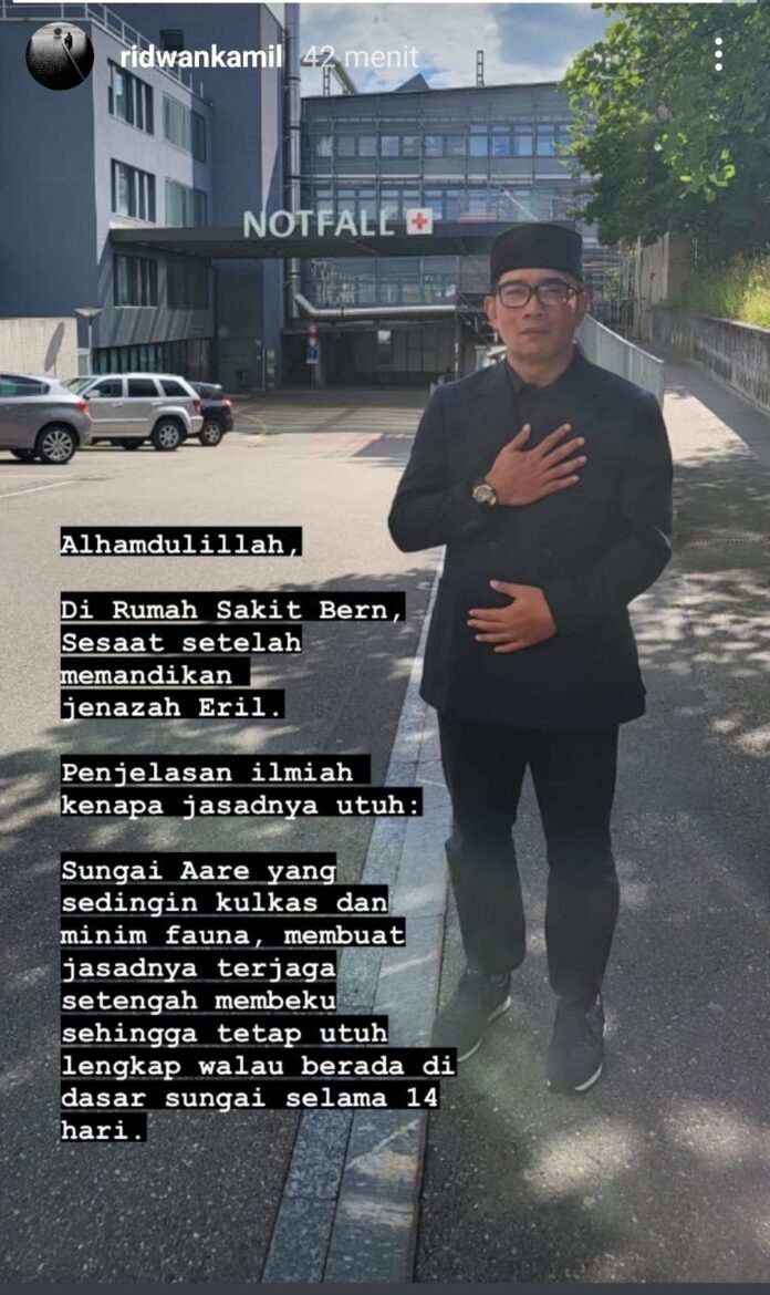 “Alhamdulillah, Di Rumah Sakit Bern, sesaat setelah memandikan jenazah Eril. Penjelasan ilmiah kenapa jasadnya utuh : Sungai Aare yang sedingin kulkas dan minim fauna, membuat jasadnya terjaga setengah membeku sehingga tetap utuh lengkap walau berada di dasar sungai selama 14 hari,” ungkap Ridwal melalui Instagram Storynya @ridwankamil, Jumat (10/6).