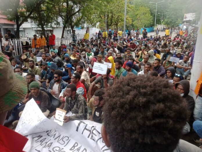 Jayapura, Mambruks.com – Aparat kepolisian terpaksa membubarkan aksi demo tolak KTT G20 yang digelar Aliansi Badan Eksekutif Mahasiswa (BEM) se-Jayapura, di Gapura Universitas Cenderawasih (Uncen), Abepura, Kota Jayapura, Rabu (16/11) siang.