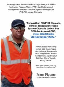 “Artinya tunjukan bahwa kami bisa, kami mampu. Stigmatisasi terhadap Pekerja Papua pemalas, pengacau atau tidak disiplin di tempat kerja itu dibuat untuk menggagalkan kita Karyawan Papua. Dan Sekarang saatnya untuk kita buktikan bahwa kami mampu dan super disiplin dalam bekerja,” tegas Frans yang adalah juga Ketua Umum Tongoi Papua tersebut. Tongoi Papua adalah wadah bagi karyawan Papua di PT Freeport Indonesia.