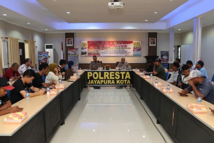 Jayapura, Mambruks.com – Kapolresta Jayapura Kota Kombes Pol Dr. Victor D. Mackbon, S.H., S.IK., M.H., M.Si bersama Wartawan se-Kota Jayapura bahas Kamtibmas melalui Para-para Numbay yang digelar di Aula Mapolresta Jayapura Kota, Selasa (10/01) siang.