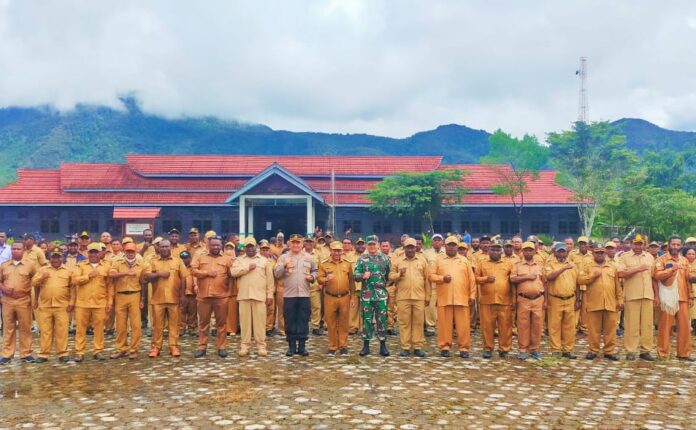 Oksibil, Mambruks.com – TNI – Polri dan ASN Pemerintah Daerah Kab. Pegunungan Bintang menggelar apel gabungan yang dipimpin oleh Bupati Pegunungan Bintang Spei Yan Bidana, S.T., M.Si., bertempat di Lapangan Pemda Pegunungan Bintang, Kampung Mobib Silibib, Distrik Oksibil, Kab. Pegunungan Bintang, Senin (16/1).