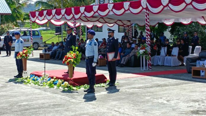 Jayapura, Mambruks.com – Kementerian Hukum dan HAM (Kemenkumham) Papua bersama jajaran Imigrasi Kelas I TPI Jayapura melaksanakan Upacara Peringatan Hari Bhakti ke-73 di Pos Lintas Batas Negara (PLBN) Skouw, Distrik Muara Tami, Kota Jayapura, Kamis (26/1).
