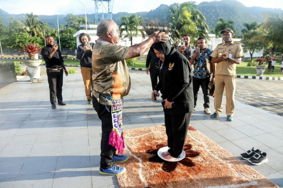 Dengan mengenakan pakaian adat khas Papua, Iyan memasangkan Mahkota Kasuari kepada Mensos. Sebagai anak adat Saireri, ia mengokuhkan Mensos Risma sebagai orang Papua dan berhak menggunakan Marga Numberi.