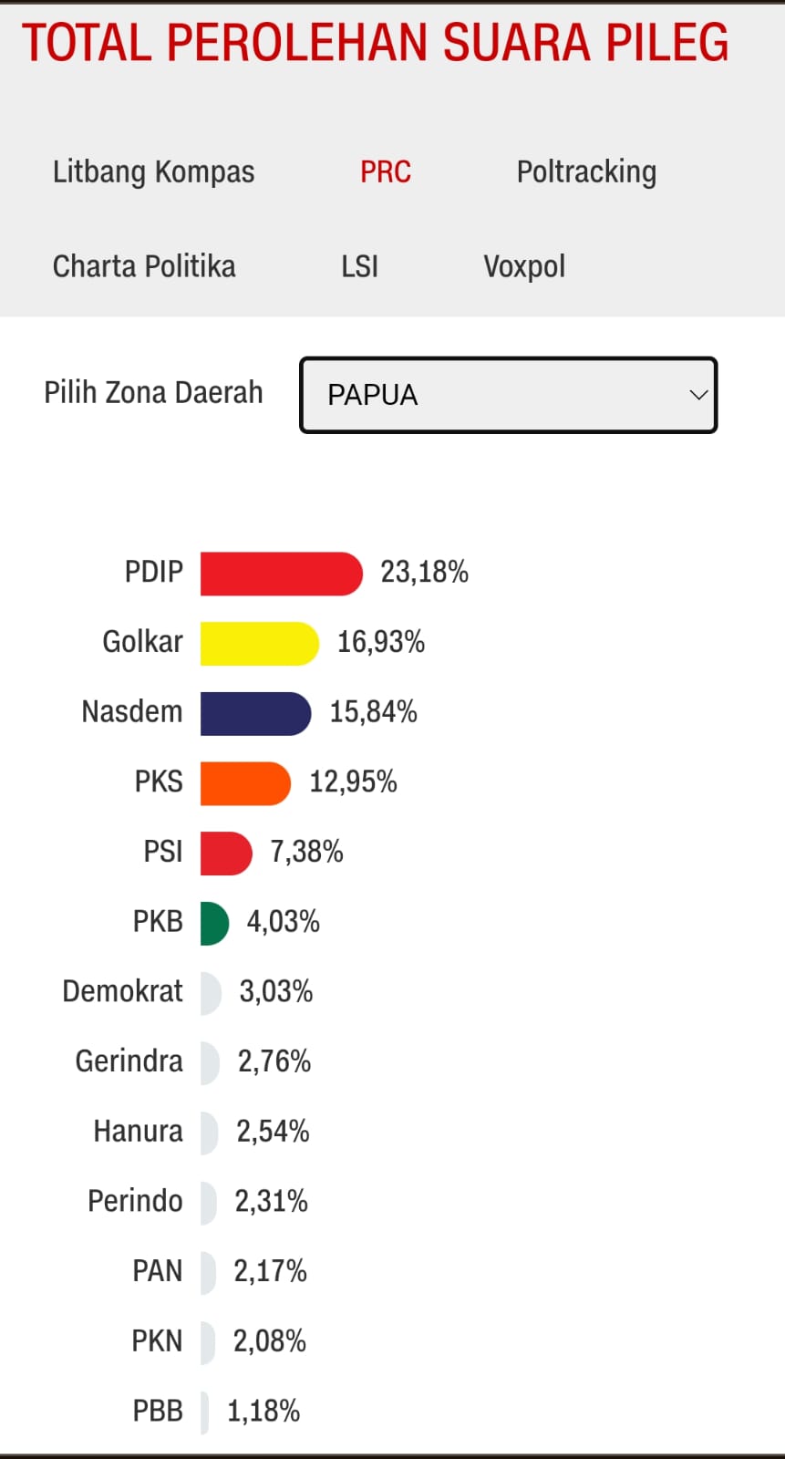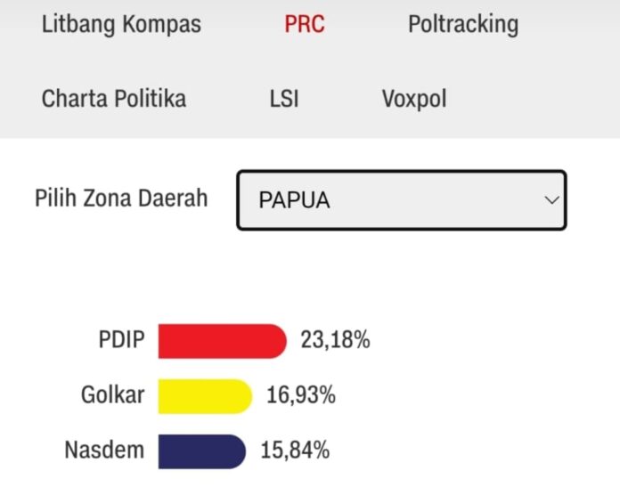 Jakarta, Mambruks.Com-Hasil hitung cepat Pileg 2024 untuk perolehan kursi DPR RI dari Daerah Pemilihan Provinsi Papua diperuntukan untuk tiga partai yaitu PDIP, Golkar dan NasDem. Berdasarkan hasil hitung cepat Lembaga Politika Research and Consulting (PRC) perolehen suara legislatif Priovinsi Papua sebagai berikut :