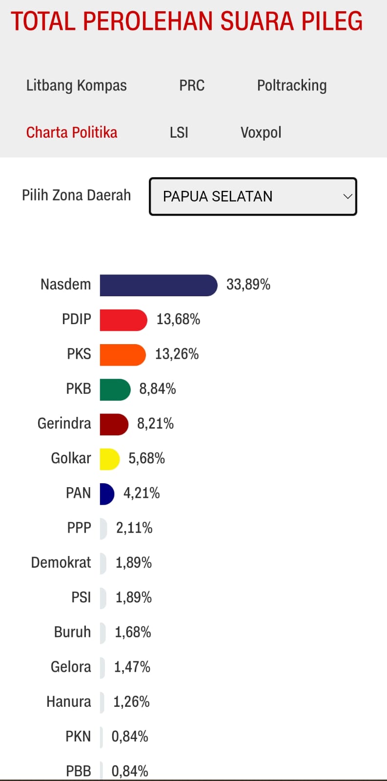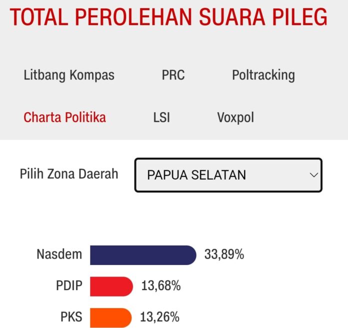 Jakarta, Mambruks.Com-Hasil hitung cepat Pollster ‘Charta Politika’ untuk hasil Pemilihan Legislatif DPR RI di Provinsi Papua Selatan memperlihatkan keunggulan 3 partai yaitu NasDem 33,89 %, PDIP 13,68 %, PKS 13,26 % (Data Masuk: 75 %).