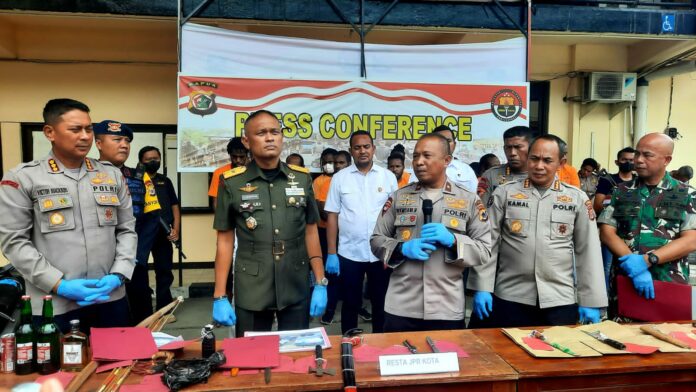 “Jadi, kami telah mengamankan total 14 orang, 7 orang diamankan di wilayah Kota Jayapura dan 7 lainnya di Kabupaten Jayapura, beserta sejumlah barang bukti hasil razia, berupa minuman keras, katapel, panah, badik, parang, pisau lipat, pisau dapur, keris, bom ikan, dan 1 unit sepeda motor,” terang Wakapolda Papua saat menggelar Press Conference di Mapolresta Jayapura Kota, Rabu (21/9).